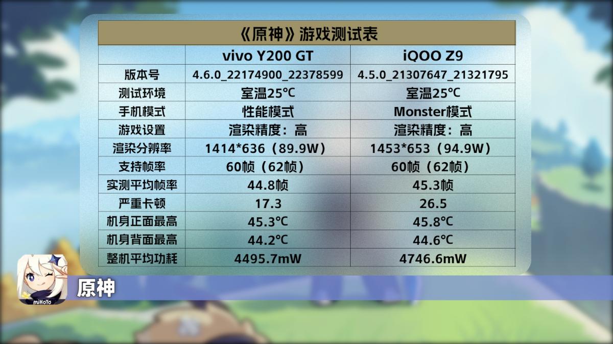 对于高负载的《原神》,渲染分辨率在640P档,一小时游戏平均帧率是44.8帧,帧率波动比较大,只有在英雄人物不动的静态状态下,帧率才能上到60帧,机身最高温度是45.3度。跟iQOO Z9对比的话,vivo Y200 GT的帧率略低一点,但是差距不大,同时温度和功耗控制的也更好一点。