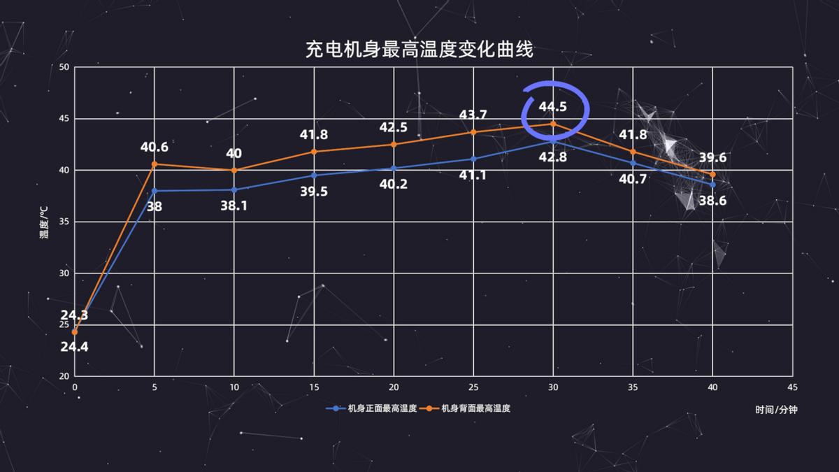 在充电过程中,机身最高温度是44.5℃,充电头最高温度是59.0℃。