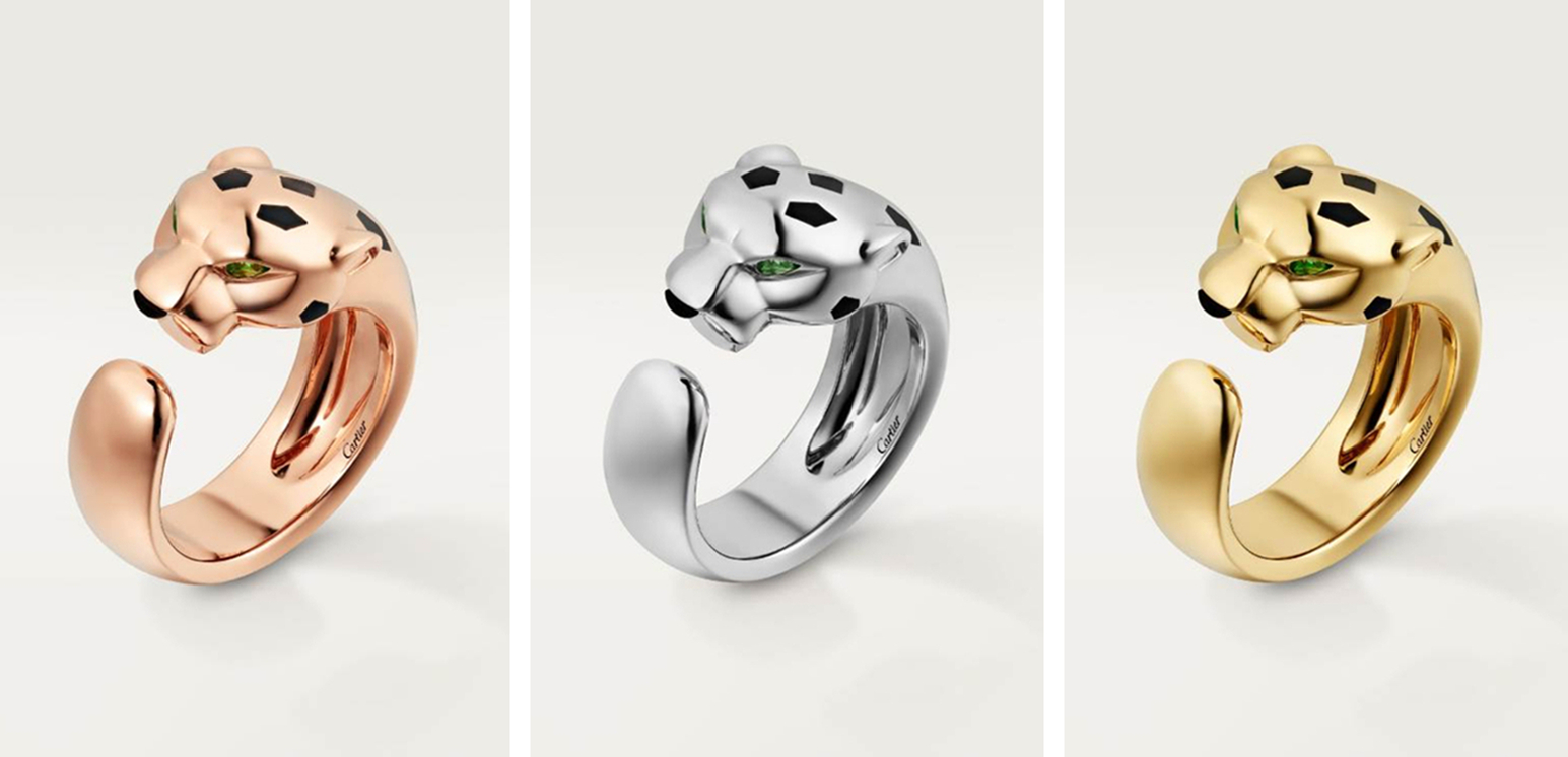 除了本期展示的白金材质外,同款式还提供了玫瑰金与黄金配置。这两个版本虽然推出时间较晚,但其温暖的色泽与醇厚的质地,更为贴近猎豹的真实感觉。除此之外,同样式还有对应的无钻款,也是提供了三色K金材质,斑纹的分布与形状同满钻款完全一致。当然,Panthère系列还有许多新奇的创意,猎豹的形态也是千姿百态、千变万化。