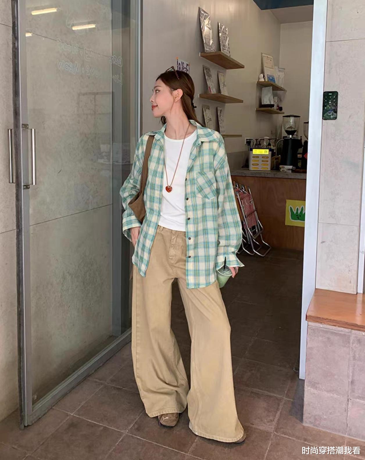 高个子女生可以尝试廓形衬衫搭配卡其色阔腿裤,整体的宽松造型带着慵懒的氛围,同时又能撑起强大气场。
