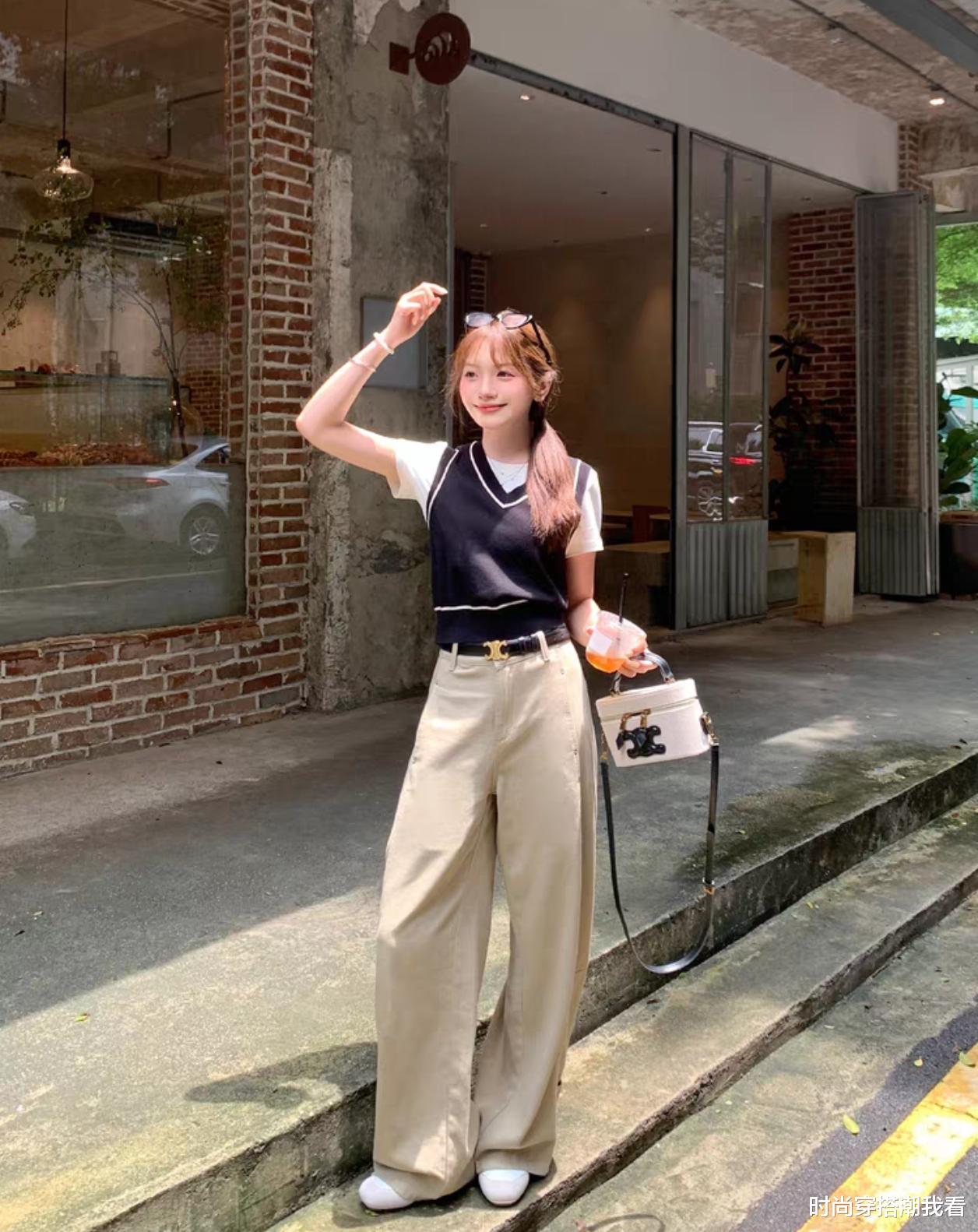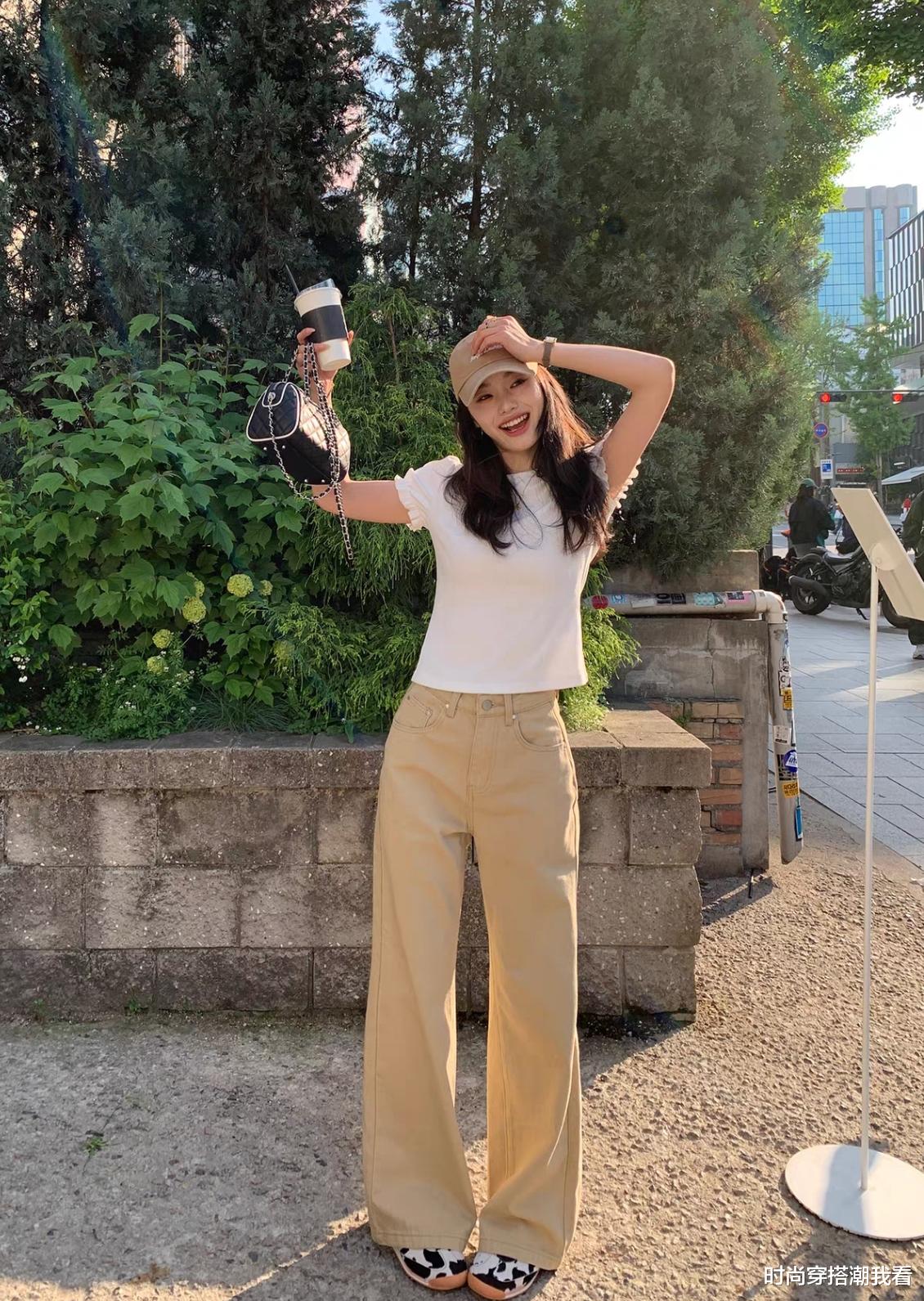 对于微胖身材的女生,尝试黑色修身T恤搭配卡其色阔腿牛仔裤,黑色显瘦,卡其裤的垂感又能藏住小肚腩和大腿肉,扬长避短的效果非常棒。