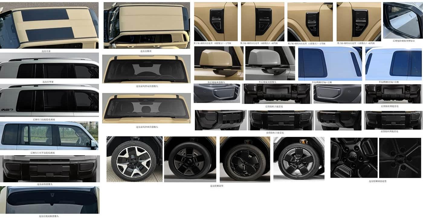 外观:硬朗有型,但不失科技感从申报图来看,iCAR V27换上了全新的外观设计语言。前脸是一条细长的格栅,两侧是方形灯腔+环形灯带,看上去既有力量感又挺新潮。下方的大面积银色护板直接告诉你——这车骨子里还是走“硬派”路线的。