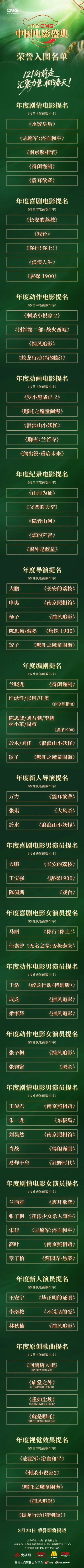 3月14日,首届CMG中国电影盛典首次从“电影类型”角度向2025年度优秀影片及电影创作者颁发荣誉。由来自主流媒体、电影专业媒体、杂志媒体、网络媒体、电影行业自媒体的100位媒体人共同推荐。乌尔善执导神话史诗《封神第二部:战火西岐》入围“年度动作电影”。