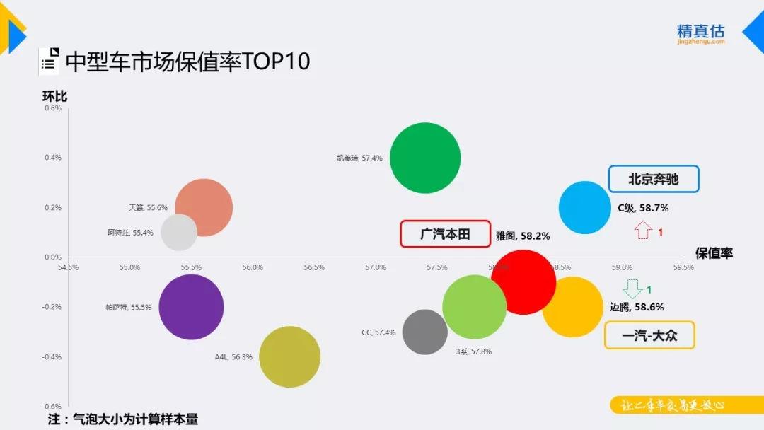 本月中型车市场中保值率TOP榜中,奔驰C级排名上升一位位列榜首,迈腾位列第二,雅阁依旧稳居第三,阿特兹保值率上升成功跻身TOP榜。从保值率浮动情况来看,中型车TOP榜中除C级、凯美瑞、天籁、阿特兹有所增长外,其他车系保值率均下降。