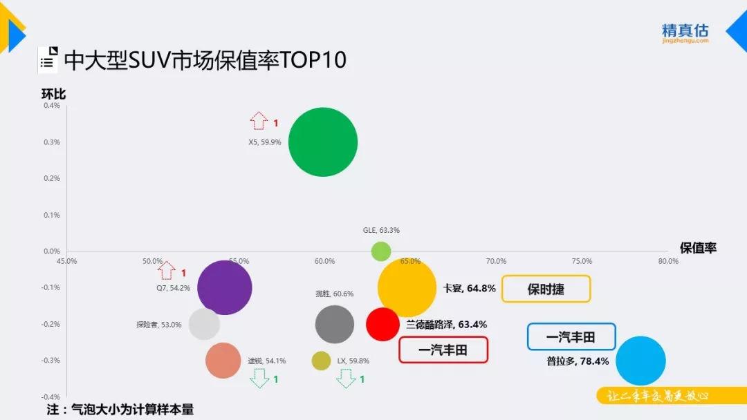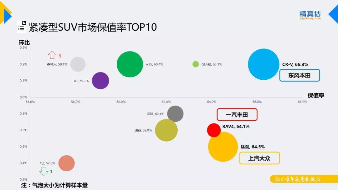 紧凑型SUV TOP榜单中, CR-V保值率依旧稳居第一的位置,不过受“机油门”影响,前途未卜。途观、RAV4保值率继续分列二、三位,H6虽然登上交易榜但因自主品牌与合资车在保值率方面仍然存在较大差距,故未能跻身保值榜。从保值率变化幅度来看,TOP榜中保值率环比增长和下降的车系各半,其中,Q3本月发生召回事件且保持较大的优惠力度,保值率下滑较为明显。