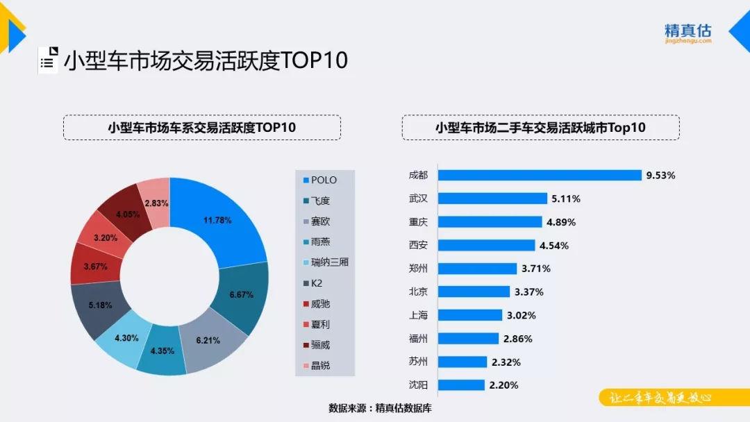 从过去的一年的新车市场表现来看,小型车市场整体持续受困,2018年随着小排量车购置税优惠政策取消,小型车市场前景预计也并不理想,二手车市场短期内活跃度将有所提升,但本月因春节前期的影响二手车活跃度小幅下滑。单从本月交易排名来看,POLO与飞度分别以11.78%、6.67%的交易占比依旧稳居该级别前二,雨燕和威驰交易排名均上升两个名次,其他车系排名小幅下降。分区域来看,成都是小型车交易最为活跃的大城市,其次为武汉、重庆、西安等,其中武汉、北京活跃度上升较为明显。