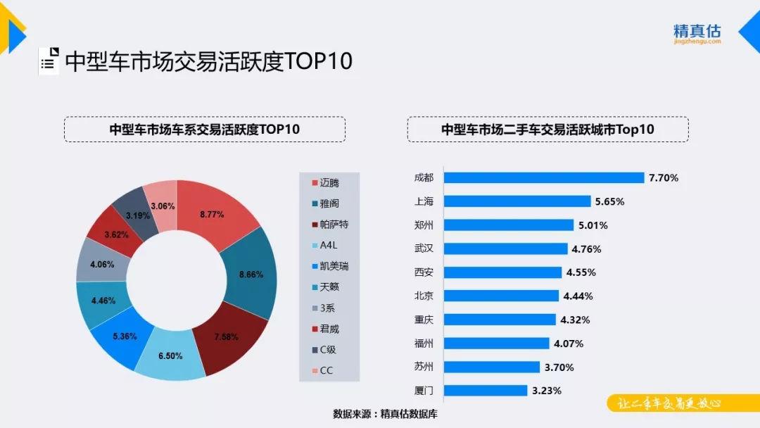 中型车市场中,虽然市场竞争暗流涌动,但表面上却波澜不惊,本月二手车交易榜排名基本稳定,迈腾、雅阁、帕萨特位列前三甲。分区域来看,中型车在成都、上海、郑州等地的市场活跃度相对较高。