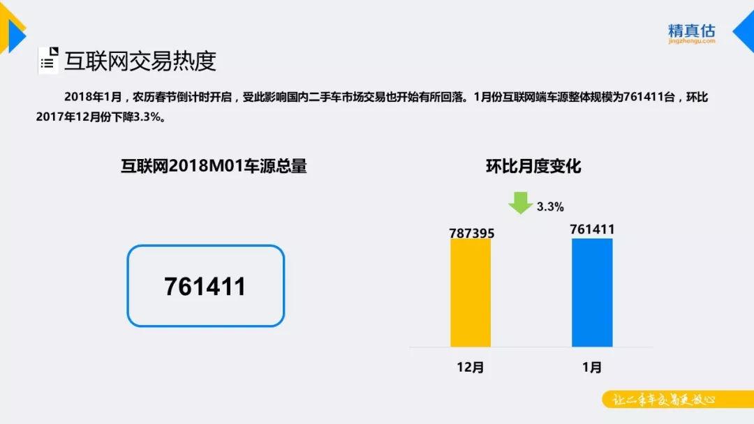 谈及车型保值率,就必然离不开二手车流通情况。随着春节倒计时开启,二手车市场整体交易量下滑,二手车商为了快速出手车辆也进一步提高了优惠力度,1月国内二手车市场在网车源合计761411台,环比下降3.3%。