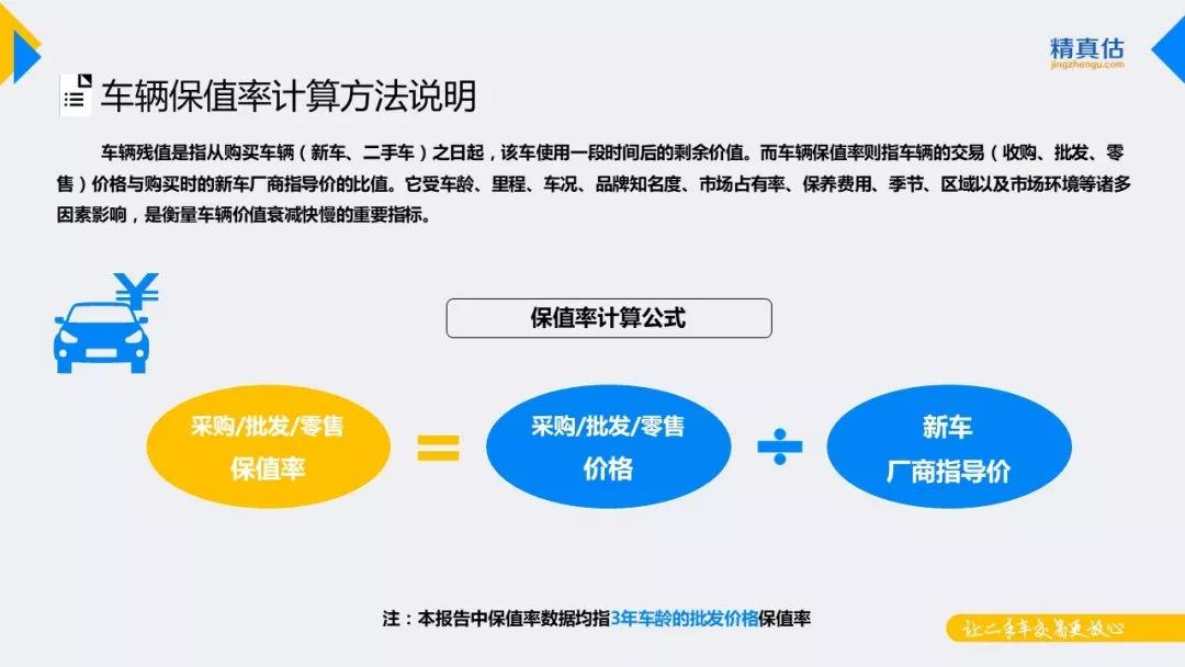 保值率对于国内消费者来说还是一个比较新的概念,它指的是二手车流通价格与新车出厂价的比值。严格说来一个车型的保值率是根据该款车型在二手车市场上的流通均价除以其新车厂商指导价而来,所以我们可以简单地理解为,二手车价格除以新车裸车价格就是保值率。