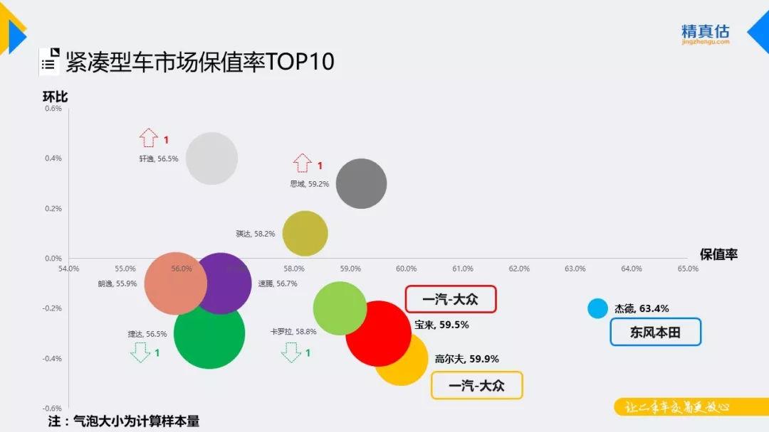 紧凑型车市场仍是大众一家独大,活跃交易榜中的5款车系同时入围TOP10保值榜,日系车保值率表现相对坚挺。杰德位强势蹿升至榜首,高尔夫、宝来分别位居保值榜第二、第三。思域、骐达、轩逸保值率环比上升,其余车系保值率均有所下滑。