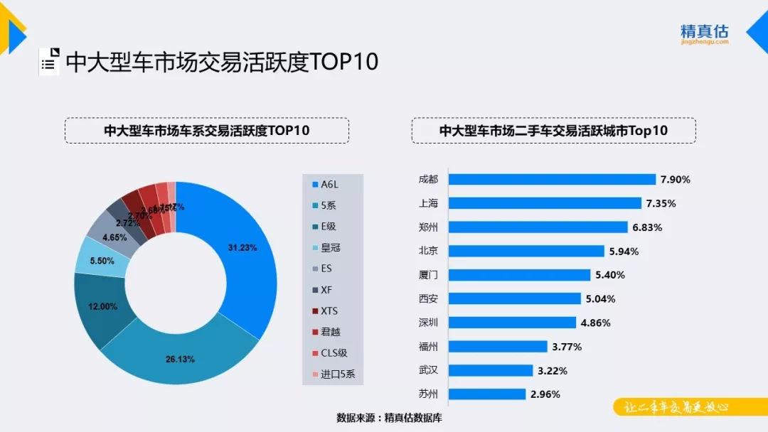 中大型车市场中,该级别市场竞争格局明朗,TOP榜排名基本稳定,交易榜和保值榜前三位均被BBA长期占据,奥迪A6L仍以绝对优势稳定位居交易榜首位,5系和E级分别位居第二、第三,君越交易活跃度有所提升入围TOP榜。分城市来看,成都、上海、郑州是本月中大型车中交易较为活跃的城市。