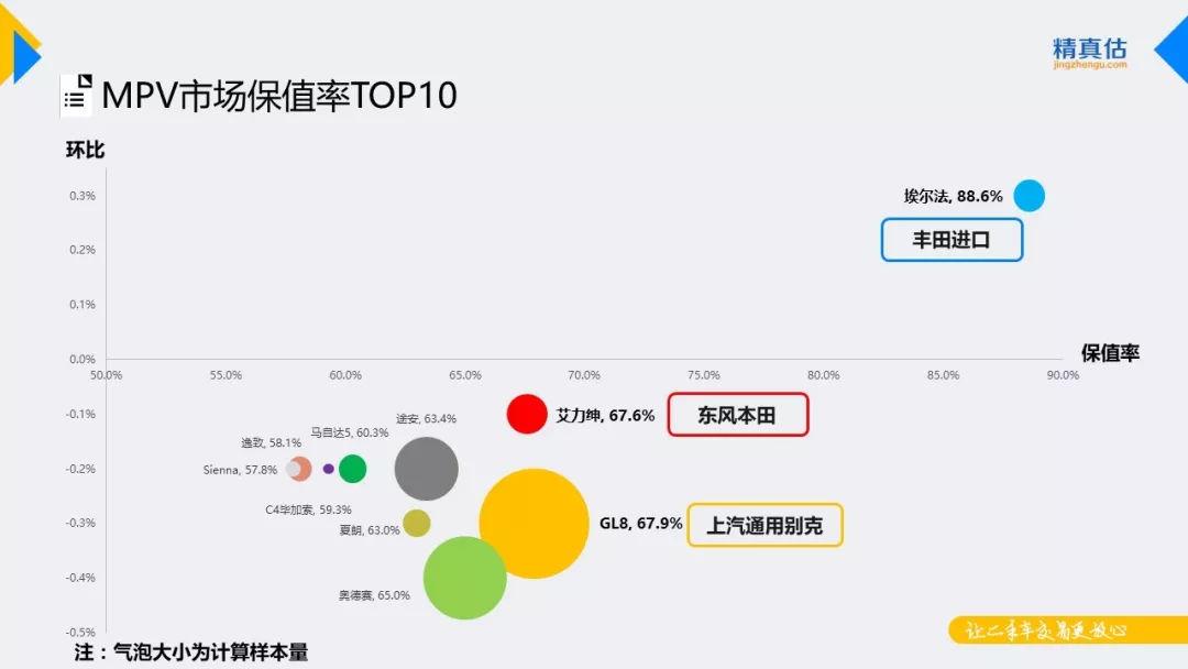 MPV市场中,保值率TOP榜排名基本稳定。由于埃尔法新车加价,因此其流通车辆保值率始终表现坚挺,在该级别车辆中始终保持遥遥领先的地位。GL8仍凭借其保有量优势而稳定的排在该级别第二位,艾力绅位居第三。本月丰田已在日本本土发售新款埃尔法,预计中规版也将在年内上市,埃尔法保值率环比增长,其他车系保值率环比均出现下滑。