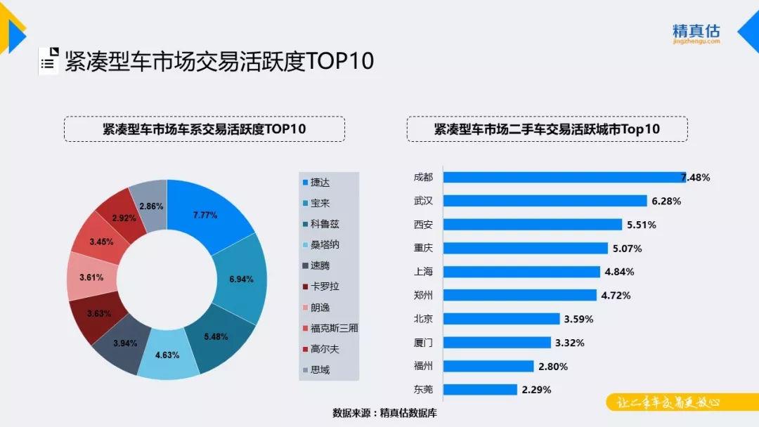 紧凑型车市场竞争激烈,但仍旧是德系与日系的天下,交易榜TOP10中大众系占了六席。捷达仍凭借其强大的保有量优势和良好的用户口碑稳坐紧凑型车市场交易榜榜首,宝来位居第二,科鲁兹活跃度超越桑塔纳位居第三,高尔夫、思域挤进前十。分区域来看,该级别车交易最活跃的城市仍为成都、武汉、西安。