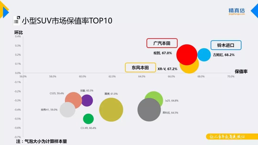 小型SUV TOP榜排名稳定,前三甲被吉姆尼、XR-V与缤智牢牢把持,哈弗H1重回TOP榜。作为小型SUV中的越野高手,铃木全新一代吉姆尼年内将在海外率先上市,本月保值率也出现了小幅上升。本田缤智和XR-V为姊妹车型,二者市场反馈良好,终端价格坚挺,保值率环比上升,其他车系保值率环比则有所下滑。