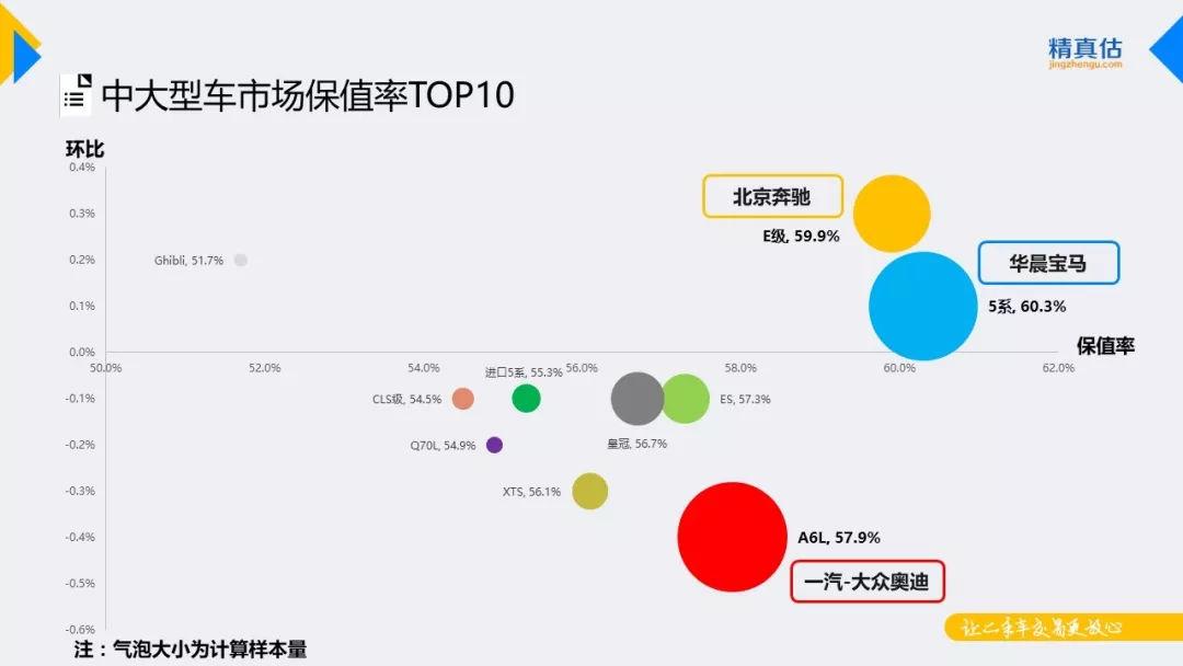 本月中大型车辆保值率排名稳定,BBA依旧优势明显,超高的市场占有率令其流通车辆稳定的排在保值率TOP榜单的前三位。5系与E级本月均有新车上市,终端优惠收窄,保值率环比小幅上涨,其他车系保值率环比均出现下滑。