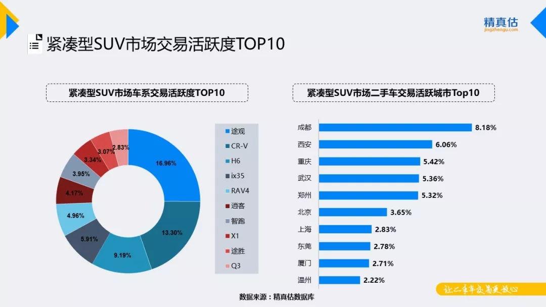 小型SUV市场是近年来新兴的细分市场,过去一年里SUV市场需求一直较为旺盛。2018年各大主流厂商着重在小型和紧凑型SUV方面发力,自主品牌与合资品牌在该级别市场的竞争也将愈加激烈。从本月市场表现看,虽然自主车型在保值率方面仍与合资车型有一定差距,但其高性价比使得自主车型在新车、二手车流通领域都表现活跃,二手车交易榜中自主车型占据半壁江山。分城市看,成都、武汉、重庆是交易活跃度较高的三大城市,小型SUV北京市场活跃度提升重回TOP榜。