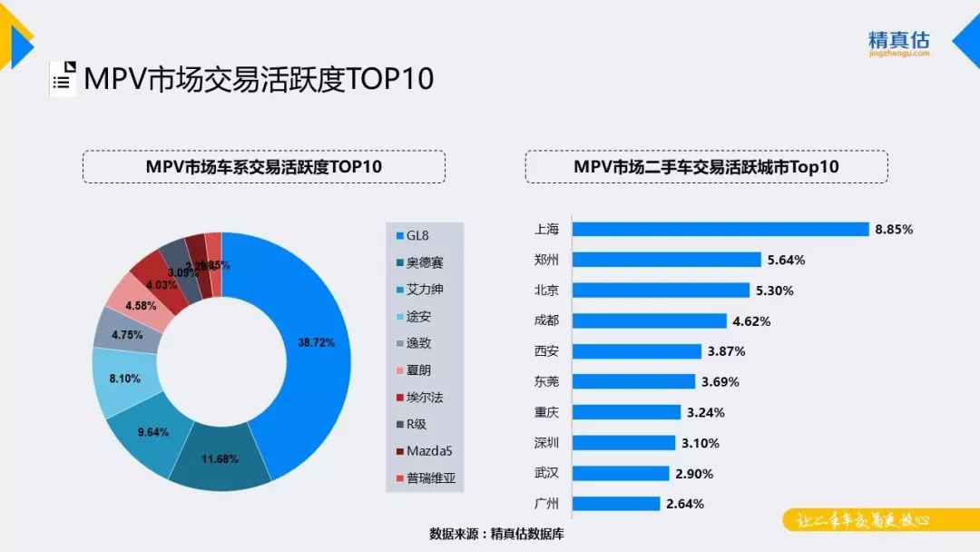 随着SUV市场的井喷,2018年MPV市场或将受到挤压。单从该级别市场来看,竞争格局明朗,GL8长期以绝对优势位居交易榜霸主地位,奥德赛、艾力绅分别位居第二、第三。另外,奔驰R级、马自达5、普瑞维亚本月活跃度有所提升入围TOP榜。从城市分布来看,上海地区MPV交易火热,其次为郑州、北京等地。