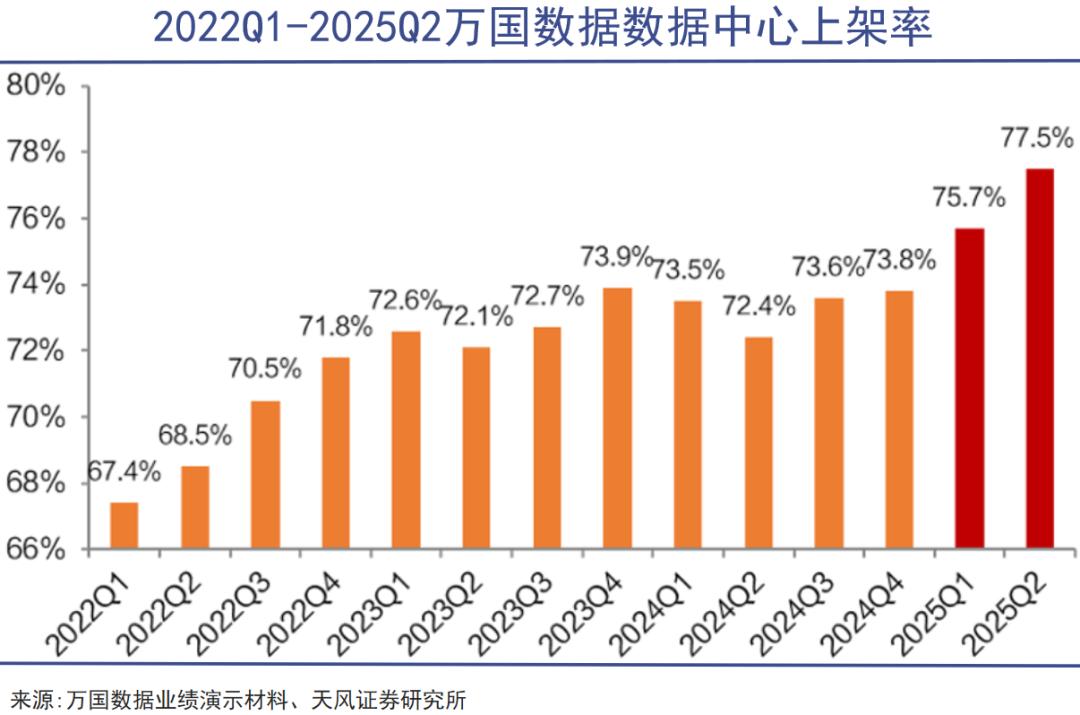 上架率是衡量IDC的关键指标,反映的是机柜“入住”情况,数字越高说明企业基础设施投入如供电、制冷等没有白费。作为对比,今年二季度万国数据上架率才来到77.5%的历史最高点,润泽科技则表示成熟的算力中心上架率超过90%。
