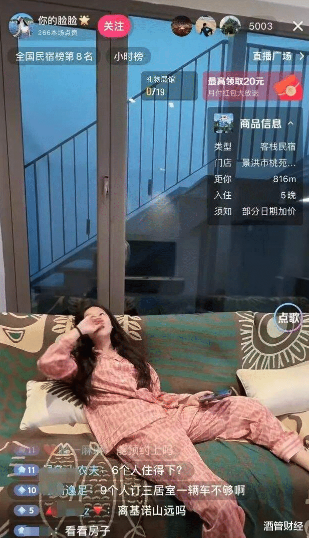 另外一位酒旅达人——脸脸,主打的就是真实和现场感。今年8月18日直播中,产品是别墅型酒店。她当着近两万直播间粉丝的面,直接“不顾形象”地跳进了别墅的泳池撒了一把野。