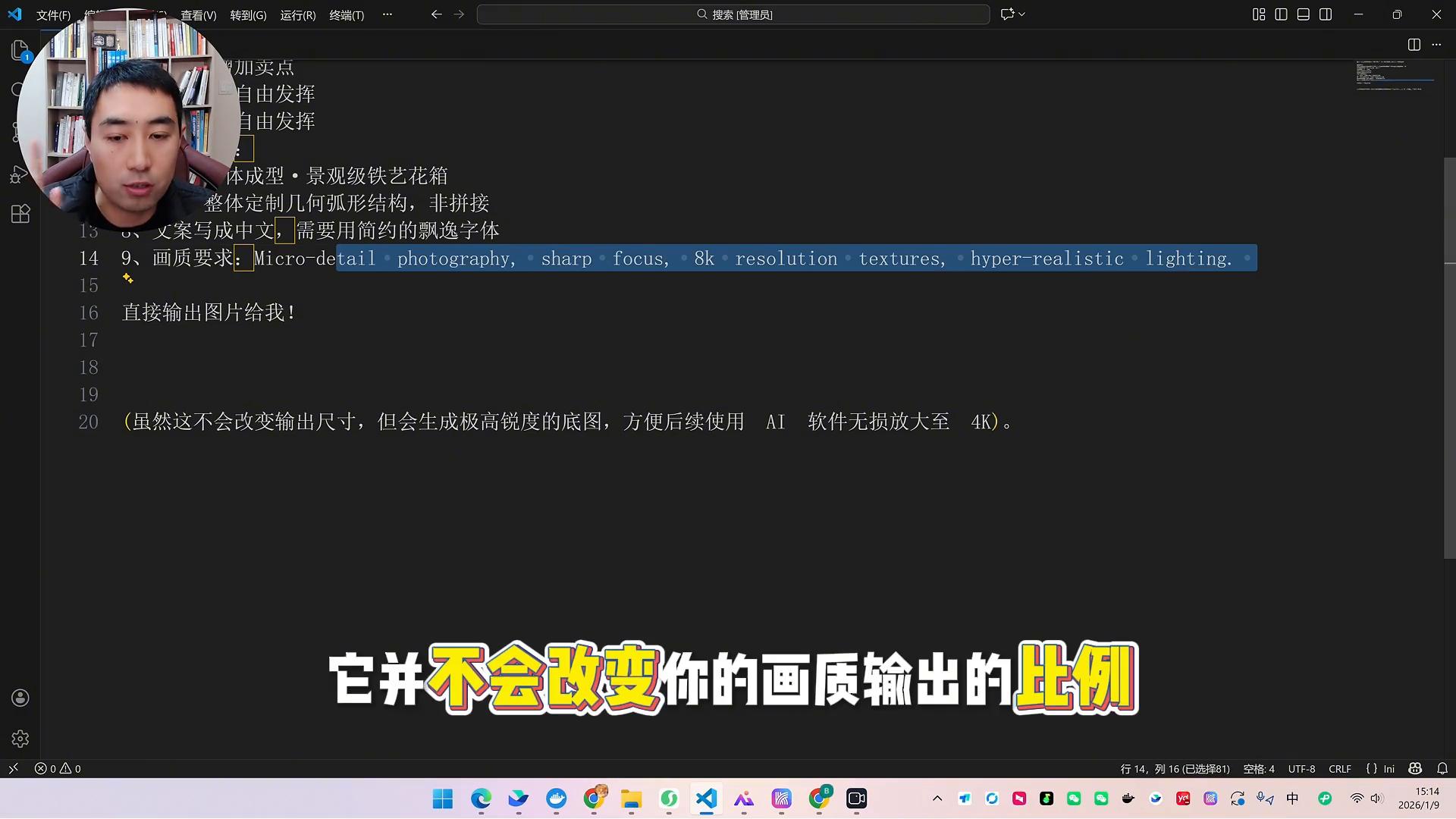 ·第一步操作,先在你的提示词里面去加画质要求,然后这个画质要求并不会改变你的画质输出的比例,比如说它不会去输出一个4K或者是8K的图片,但是加了这个提示词之后,它为你后期转换成4K或者是8K提供了无损放大的基础。所以第一步先去加提示词,然后提示词我也会放在评论区。