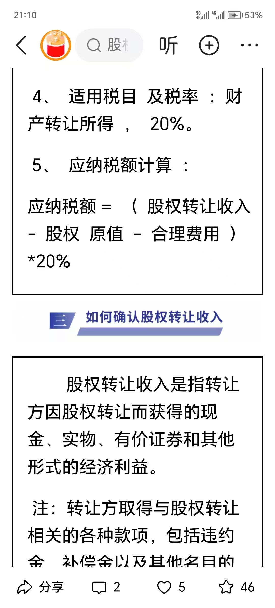 而根据《国家税务总局关于发布〈股权转让所得个人所得税管理办法(试行)〉的公告》(国家税务总局公告2014年第67号)第四条规定,个人转让股权,以股权转让收入减除股权原值和合理费用后的余额为应纳税所得额,按“财产转让所得”缴纳个人所得税。