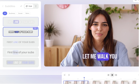 Veed.io 是一款功能非常全面的在线视频编辑器,深受全球内容创作者的喜爱。视频翻译是其强大的功能之一,用户上传商品视频后,可以利用它的AI工具一键自动生成原始语言的字幕,在简单校对后,即可将字幕翻译成上百种语言,用户可以选择将翻译好的字幕直接“烧录”进视频画面,也可以单独下载不同格式的字幕文件,灵活性很高。
