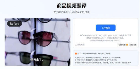 翻译视频文字/字幕:如果你的商品视频主要是音乐背景+少量关键信息文字,则建议你选用这个模式来进行翻译。系统会检测画面内的文字以及已经存在的硬字幕,并将其消除,然后为其配上相应的翻译版本。