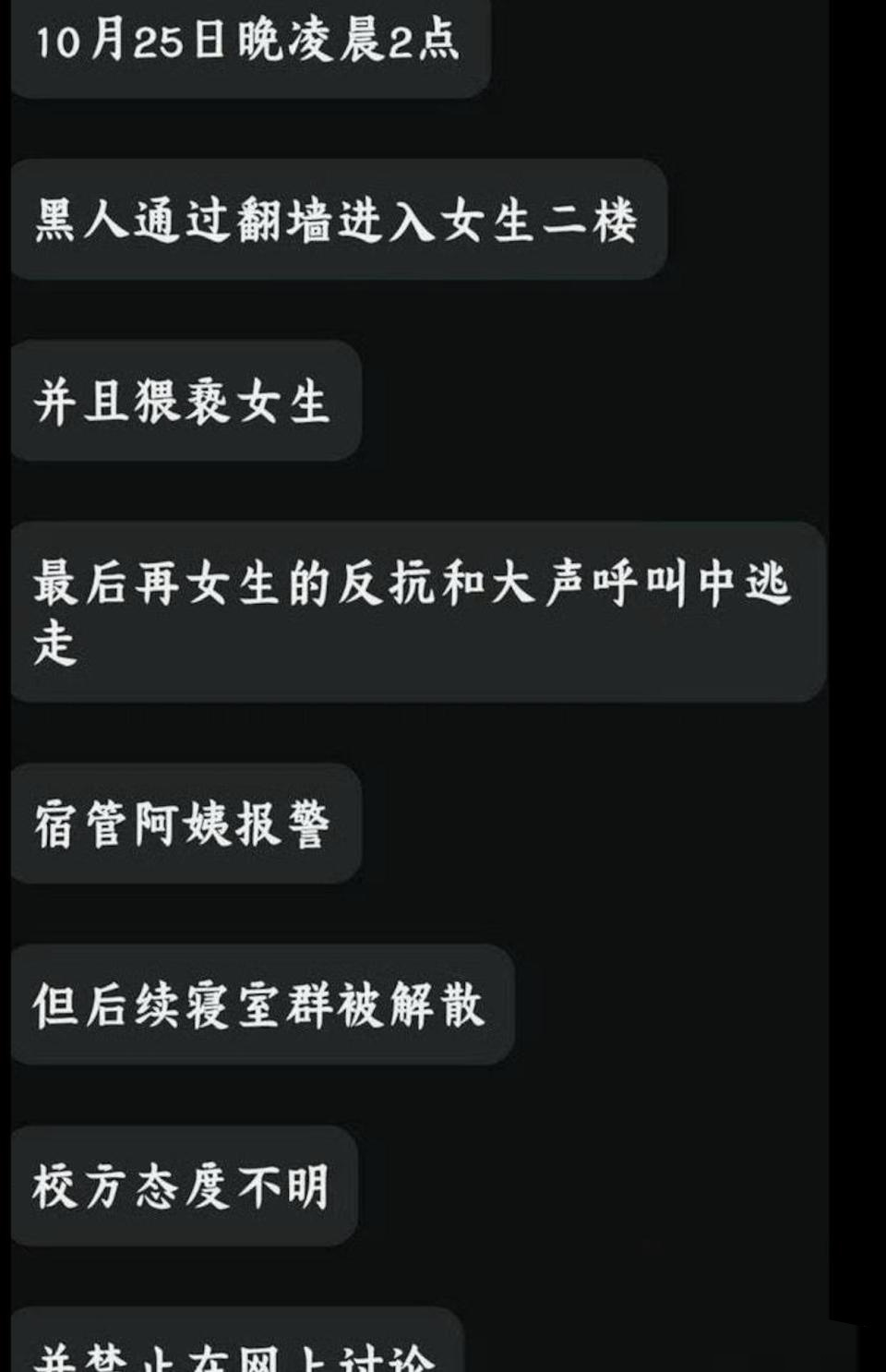 据知情人士及网友发布的信息显示,事件发生在 10 月 26 日凌晨两点左右。涉事留学生从女生宿舍一楼铁窗攀爬至二楼,进入宿舍后触摸一名女生头部,女生惊醒后激烈反抗,在搏斗过程中脸部被打伤。随后,女生跑出宿舍呼救,宿管阿姨紧急报警,民警迅速赶到现场进行调查和搜寻。有视频记录显示,民警在宿舍内仔细询问情况,并从阳台向下探查,现场氛围紧张。