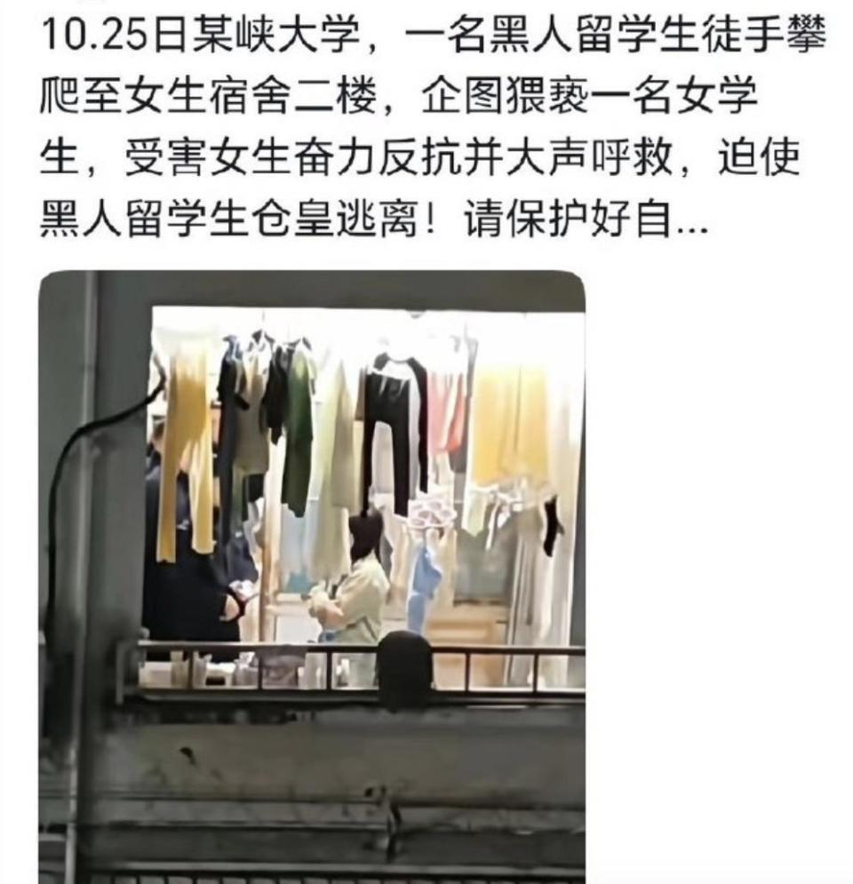 10 月 28 日,多位网友在社交平台发布消息,称湖北宜昌三峡大学一名外籍留学生于深夜徒手攀爬进入女生宿舍二楼,试图实施猥亵行为。网帖中提及,该留学生通过攀爬手段进入宿舍,引发了公众对校园安全的强烈关注。事件经网络传播后,相关内容迅速获得数百万播放量,评论区大量留言表达了对涉事女生的关切以及对校园安全隐患的担忧。