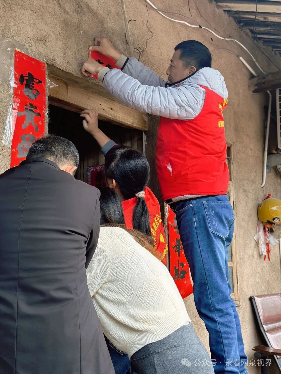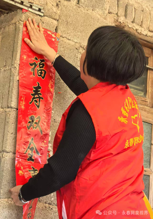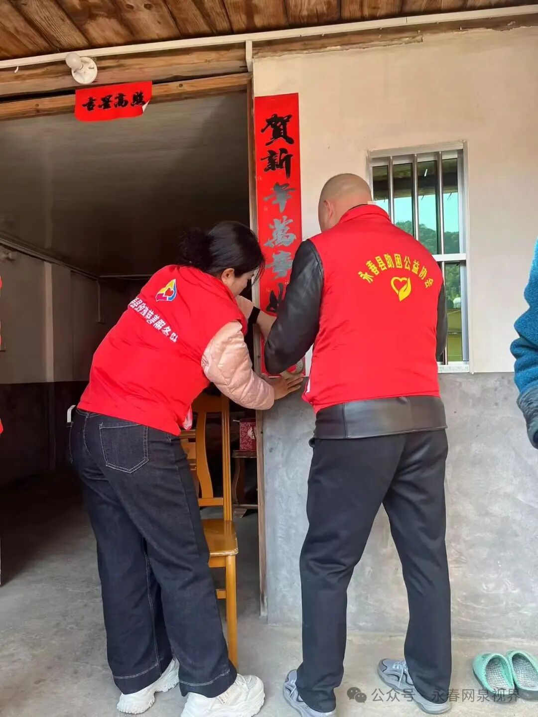 在送上关怀与慰问的同时,志愿者们还主动拿起春联为他们张贴新春对联,红彤彤的春联贴上门楣,年味与暖意瞬间洋溢在屋内屋外,让原本冷清的家中多了几分热闹与喜庆。大家一边张贴,一边送上真挚的新春祝福。