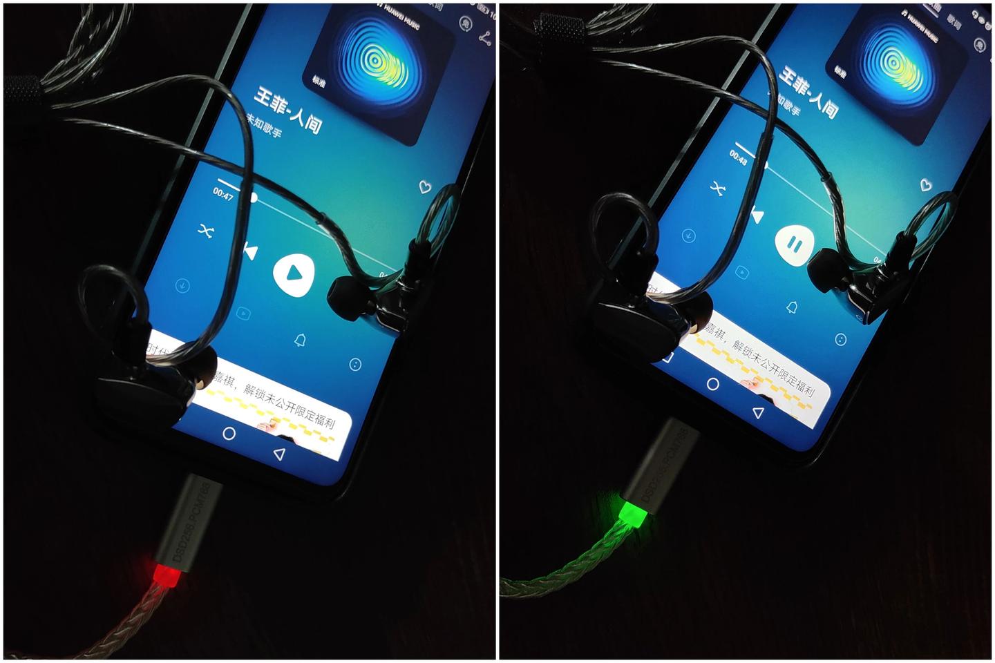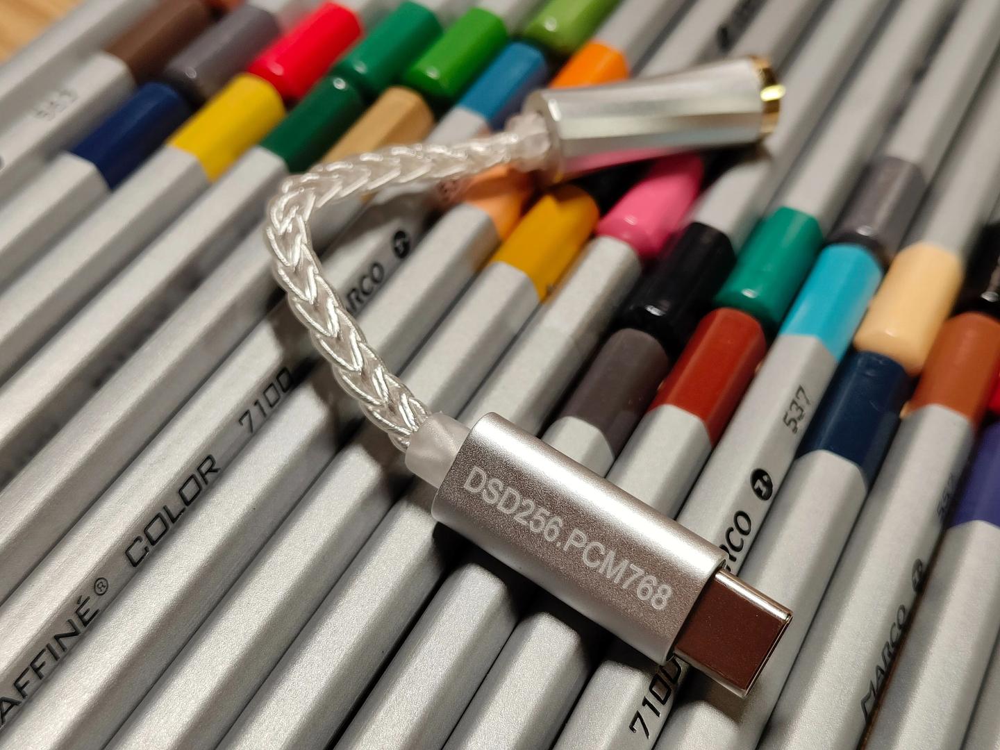 到手第一感受就是小巧便携,小蛮腰外观和一条普通的耳机转接线没有多区别。8 股镀银线芯用料扎实,最贴心的是机身的状态指示灯:红色开机,蓝色代表 DSD 解码,绿色对应 PCM 解码,不用猜来猜去有没有正确解码,用户一眼看明白工作状态,方便无比。