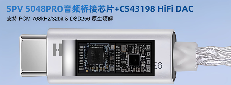 当然,音频设备的核心永远是硬实力。圈内人都知道,DSD 解码能力是衡量耳放等级的核心标准之一,AE6 直接给到了DSD256 硬解规格,同时支持PCM 768kHz/32bit 解码,搭配 SPV5048pro DAC 芯片 + CS43198 耳放芯片的双核心组合。