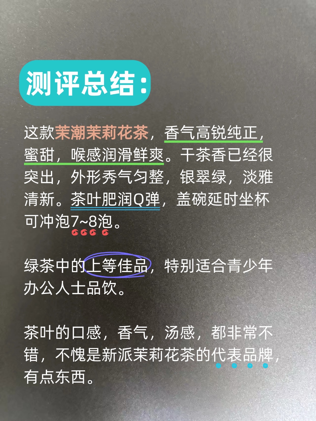 茶叶的口感,香气,汤感,都非常不错,不愧是新派茉莉花茶的代表品牌,有点东西。