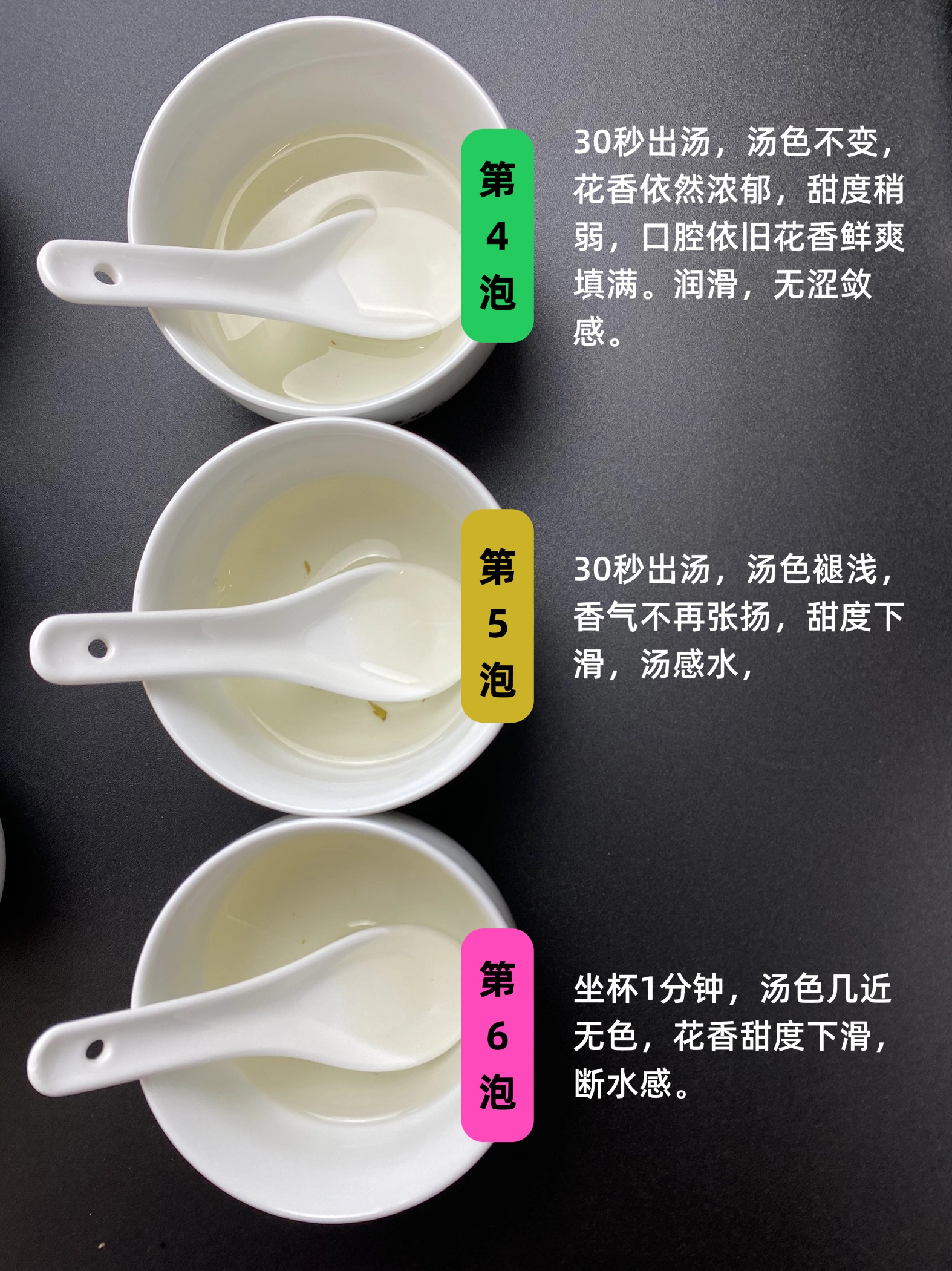 第五泡30秒出汤,汤色褪浅,香气不再张扬,甜度下滑,汤感水,