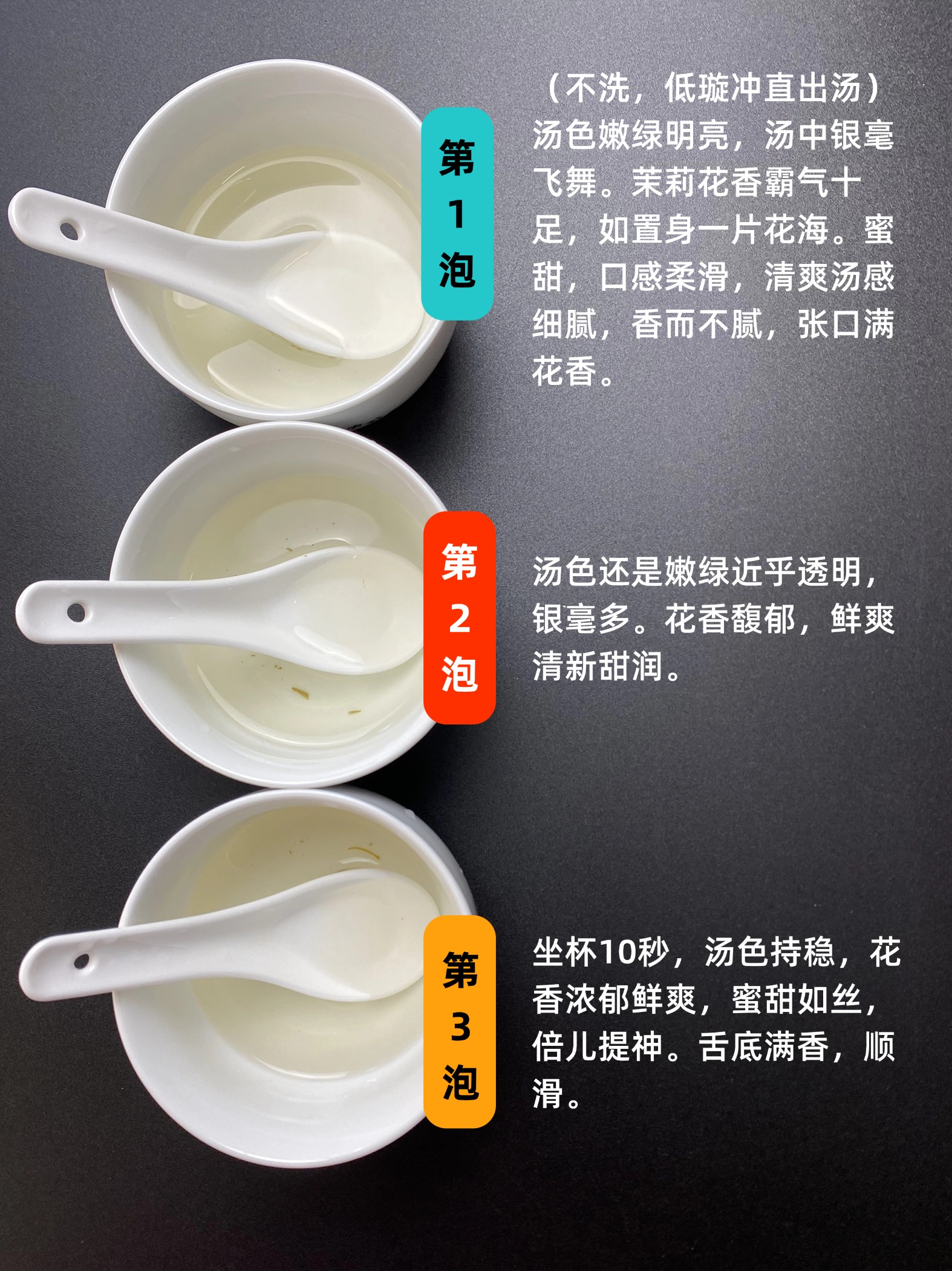 第一泡,(不洗,低璇冲直出汤)汤色嫩绿明亮,汤中银毫飞舞。茉莉花香霸气十足,如置身一片花海。蜜甜,口感柔滑,清爽汤感细腻,香而不腻,张口满花香。