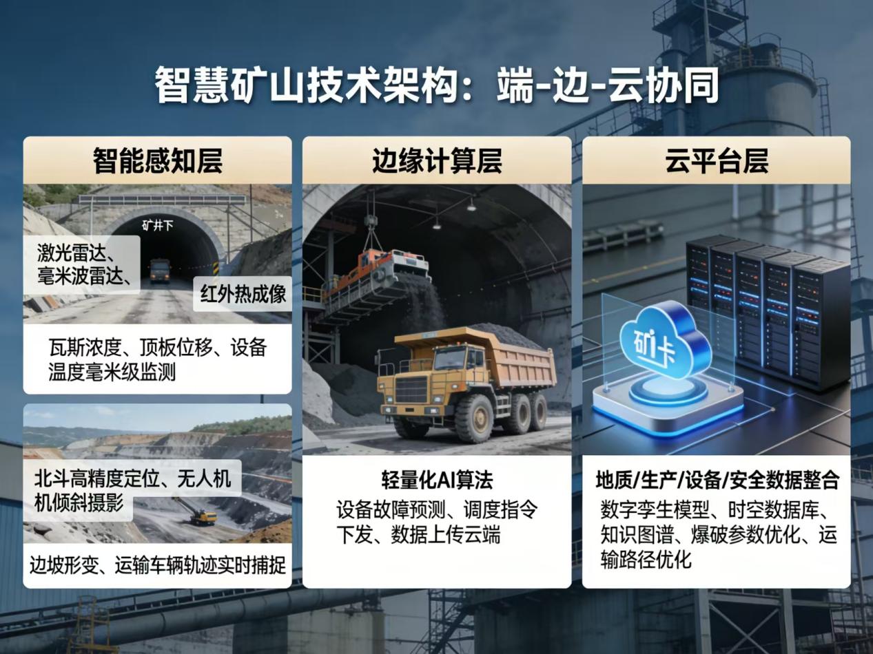 一、技术架构:构建矿山“数字神经中枢”智慧矿山的技术架构以“端-边-云”协同为核心,通过多模态数据融合与智能算法引擎,实现从感知到决策的闭环控制。
