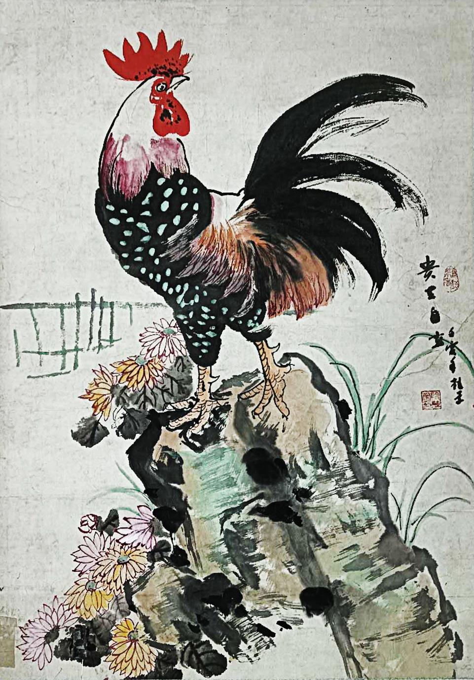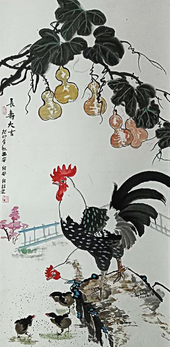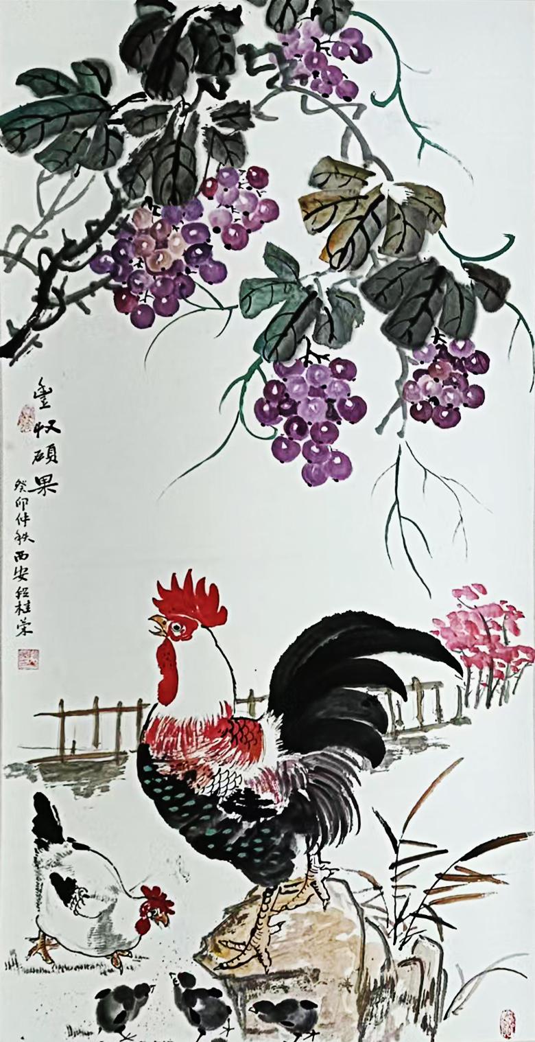 段桂荣对"鸡"这一意象的塑造尤其值得玩味。相比传统文人画中象征"五德"的程式化表现,他笔下的公鸡充满泥土气息:红冠如燃烧的火焰,羽毛蓬松似刚结束田间争斗,眼神中透着农家庭院的警觉与机敏。这些源自生活观察的细节,使其作品超越了吉祥图案的浅表含义,成为关中农民精神气质的外化象征。让我们感受道段桂荣的公鸡不是画出来的,而是从黄土地上长出来的。