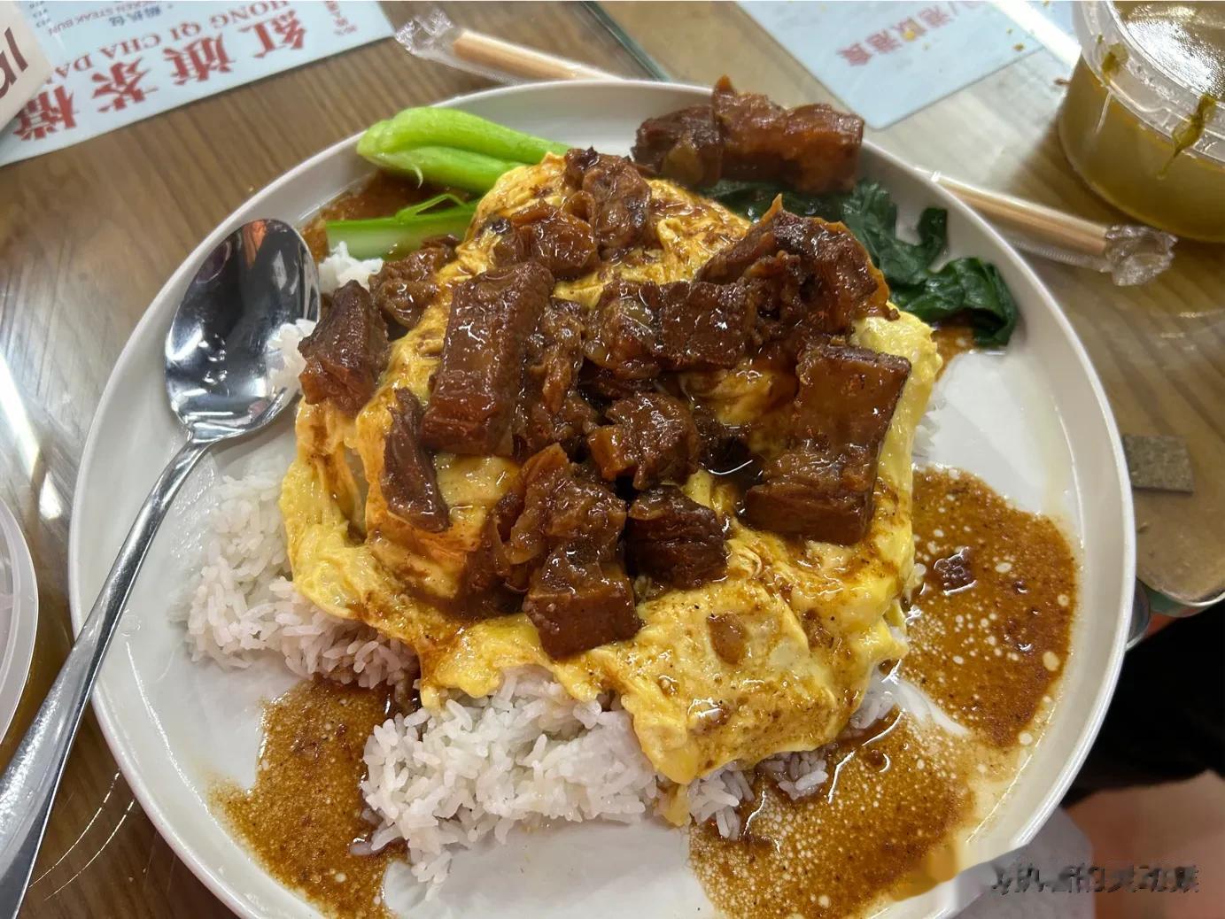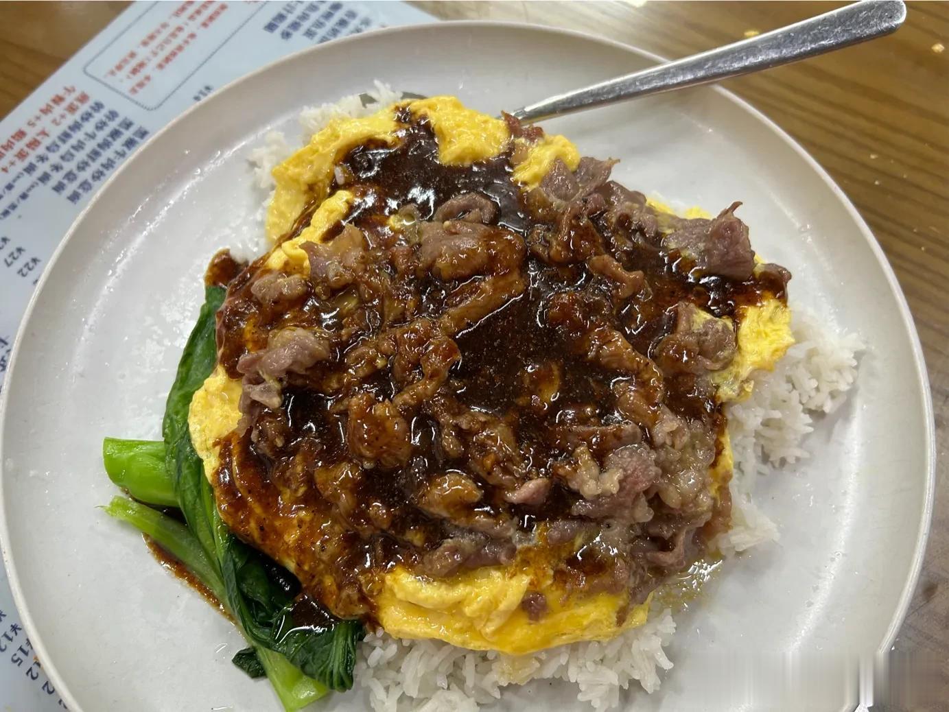 我们的牛腩公仔饭端上来,看着牛腩饭,上面好多块牛腩,牛腩紧实筋道,还有一个嫩嫩的滑蛋,最下面是白米饭,旁边有两颗菜芯点缀,瞬间对牛腩公仔饭的好感拉满,吃起来也是绝对满足味蕾。(其实和盖浇饭差不多)