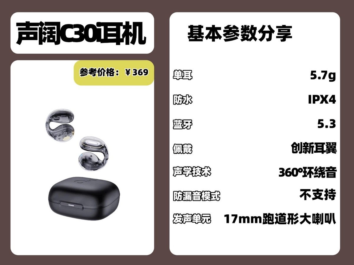 这款耳机采用了人体工学设计,佩戴方面是基于全球10000+人耳数据设计,单耳重量仅有5.7克,耳机还给到了两套可更换的耳翼,能够适配不同的耳型,耳机佩戴上贴合耳廓,就是耳机的材质有些硬,戴着会夹耳朵,音质方面使用的是17mm跑道形大喇叭,低频下潜足够深,细节还原的很丰富,还采用了360°环绕音效技术,性能方面使用的是蓝牙5.3芯片,连接速度很快,还能支持APP操作,IPX4级别的防水防汗能力,单次续航达到了10小时,搭配充电盒使用总续航40个小时,总体来说还可以!