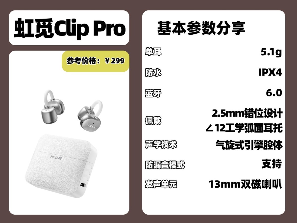 这款耳机的音质效果可以说是500价位耳夹式耳机当中最出色的,佩戴方面使用的是前高后低的2.5mm错位设计,更能贴合耳朵,戴着非常稳定,电池部分使用的是∠12弧面耳托设计,恰到好处的弧面造型更能贴合耳部轮廓,佩戴起来十分舒适,戴久了也不会觉得夹耳朵;音质方面还经过了三重升级,足以和千元耳机扳手腕,13mm双磁喇叭,由两块高精度的磁铁叠加在一起的磁铁,有利于增强磁场,让声音变得更清晰,音量会更充足,还有石墨烯科技振膜和虹觅声学实验室的加持,音质更加饱满有力,气旋式引擎腔体技术还能打造圆柱形腔体,从而加强声音的推力,让音量变得更大,低音更有力度,在500元内的耳夹式耳机中可以说是音质最好的了,性能方面使用的是最新蓝牙6.0芯片,连接很稳定,用了近一个星期也没有出现断连的情况,还支持虹觅自研的防漏音模式,开启后能大幅度降低漏音现象,解决开放式耳机漏音的痛点,传输速度还很快,通话效果不错,配备四个麦克风,接打电话哦都很清晰,,还有支持智能一拖二功能,可以同时连接两个设备,手机与电脑的设备切换十分方便,还拥有IPX5级别的防水效果,能够应对运动出汗的场景,续航方面单耳单次可用8小时,搭配充电仓使用综合续航达到了40个小时,可以说是一款闭眼入的耳夹式耳机。