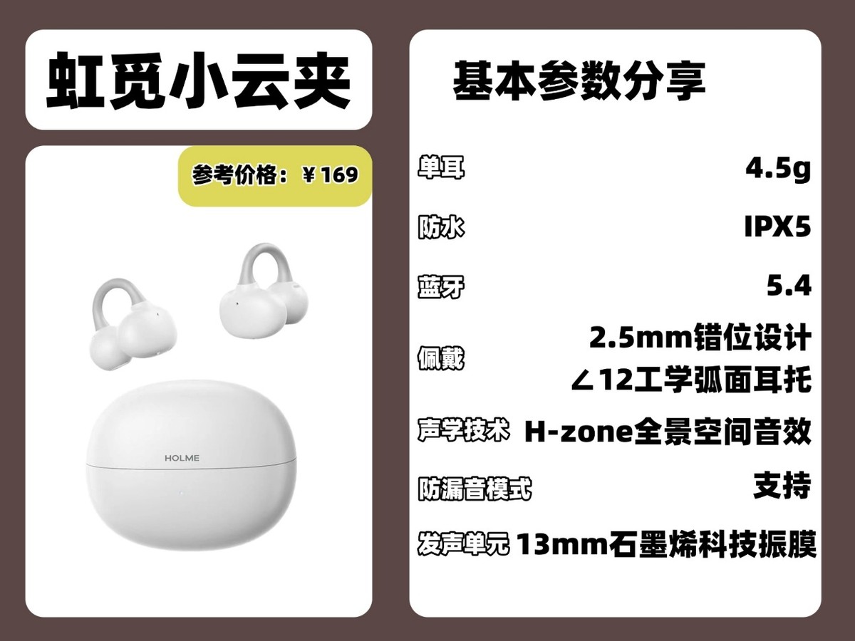 虹觅小云夹可以说是百元价格段全能型选手,佩戴方面采用的是前高后低的2.5mm错位设计,能够完美的贴合耳朵轮廓,电池部分采用的是∠12弧面耳托设计,可以进一步提高对耳朵的贴合度与舒适度,单耳只有4.5g,佩戴时没有明显的夹耳感,音质上采用的是采用13mm石墨烯科技振膜单元,能够精准的呈现出声音的各种细节,支持H-zone全景空间音效,让现场更强,声音更加细腻、饱满;性能方面还支持虹觅自研防漏音模式,开启后能够明显感受到降漏音效果,搭载蓝牙5.4芯片,还支持HBC智慧双联,支持IPX5级防水效果,单耳续航达到了8小时,配合充电仓续航就到32小时,还支持双麦克风ENC通话降噪效果,可以说它是百元耳夹式蓝牙耳机中的全能型选手。