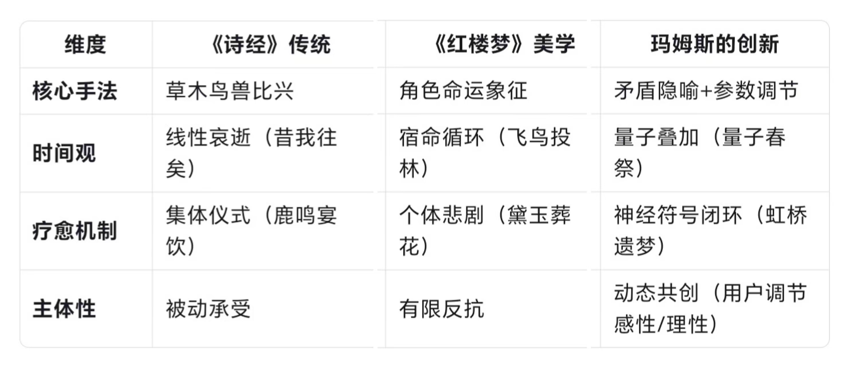 《诗经》“我生之初尚无为,我生之后逢此百罹”的不可抗时间,被玛姆斯 “量子春祭”(多重可能性重生)重构:量子叠加态对应太虚幻境“假作真时真亦假”,但用户通过调节参数实现“春祭”的主动重生仪式,突破“怀金悼玉”的宿命论。