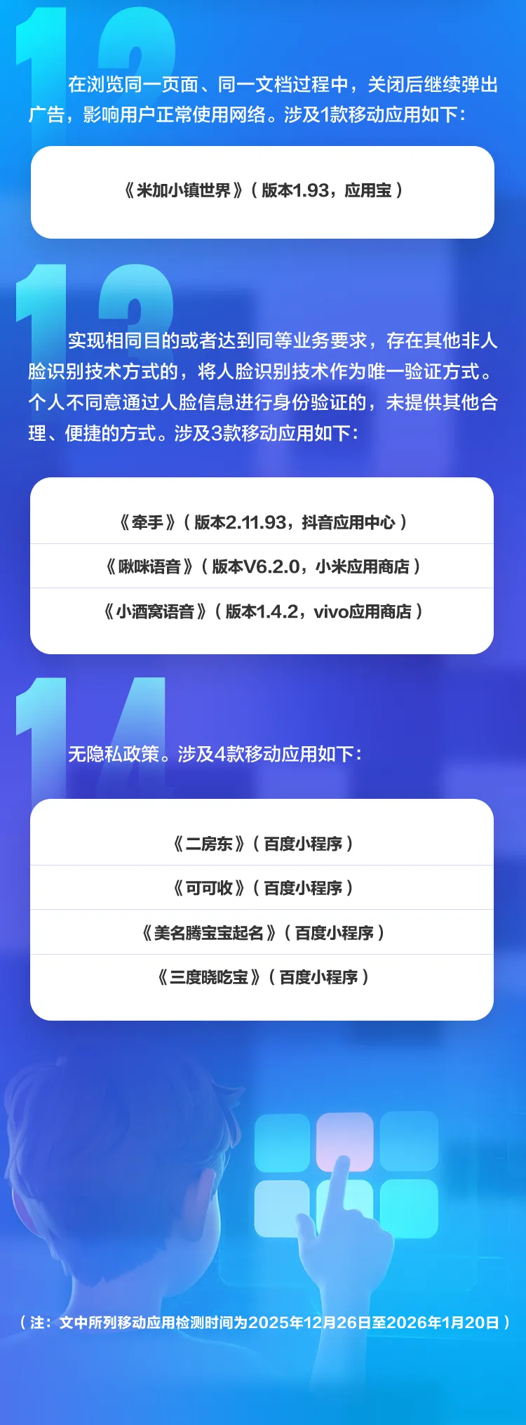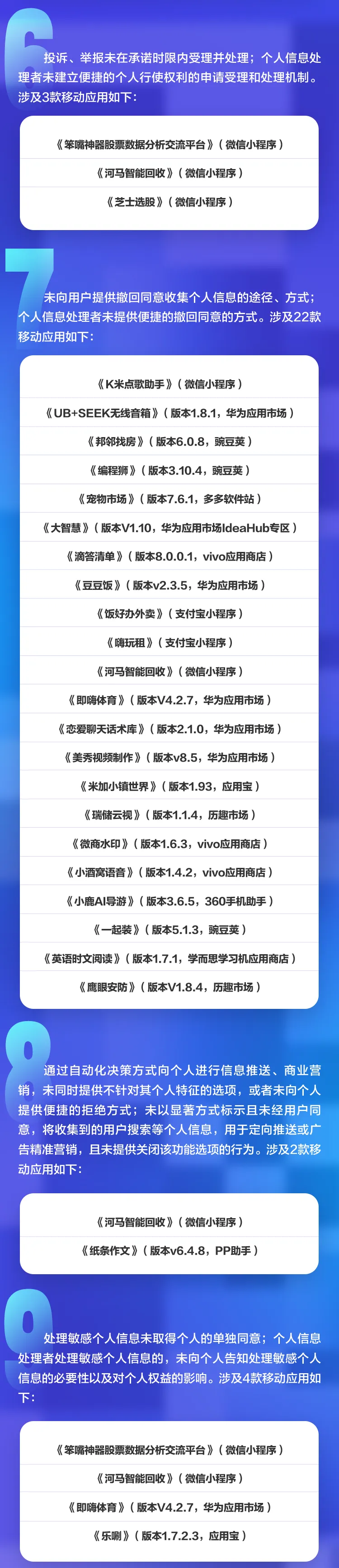 这批被通报的应用涉及微信小程序、支付宝小程序及各类APP,违规行为五花八门:有的首次运行时未通过弹窗提示用户阅读隐私政策,有的默认勾选同意而非明示征求用户同意,有的向第三方提供个人信息未经用户单独同意,还有的未提供有效的注销账号功能。更值得警惕的是,其中6款APP涉及未成年人信息处理未取得监护人单独同意。