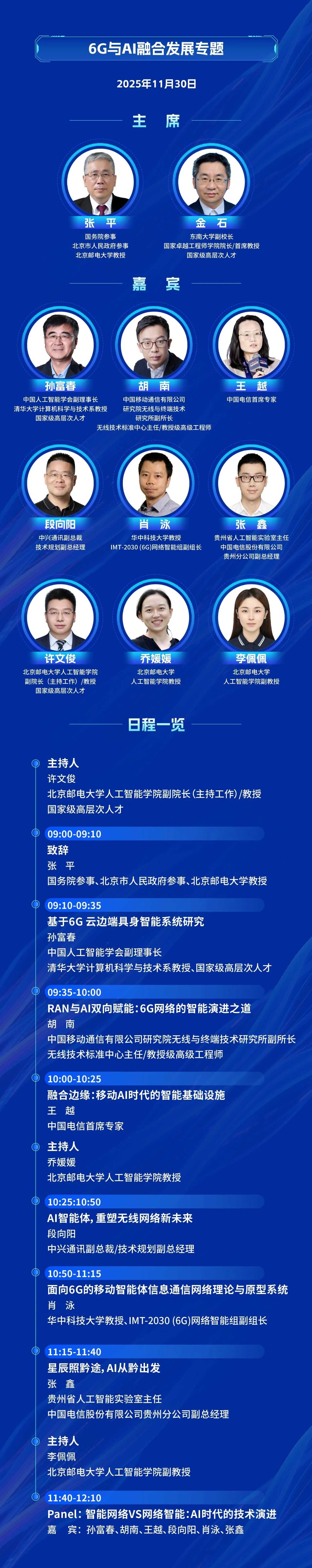 中国人工智能学会副理事长、清华大学孙富春教授将阐述如何基于6G网络,构建一个云、边、端协同的具身智能系统。中国移动通信有限公司研究院胡南工程师将阐述RAN与AI的相互作用机制,揭示6G网络实现智能内生化的技术路径。中国电信首席专家王越将分析移动AI时代边缘计算与核心网的融合方案,构建支撑智能业务的下一代基础设施。中兴通讯副总裁段向阳将探讨AI智能体如何重构网络架构,推动无线网络的演进与革新。华中科技大学肖泳教授将提出移动智能体通信网络的理论框架,并展示其原型系统的关键突破。贵州省人工智能实验室张鑫主任将结合区域特色,展示AI技术在6G时代的落地场景与产业化前景。专题报告后,嘉宾们将围绕“智能网络VS网络智能:AI时代的技术演进”展开圆桌对话,深入探讨大模型、生成式AI等核心技术如何从底层重塑通信网络的未来,为行业发展提供战略思考与方向指引。