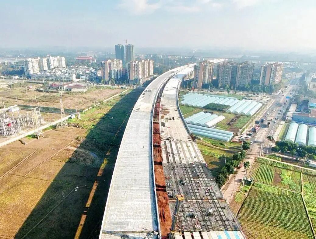 同时,施工过程中,项目建设面临高等级高压电力线拆迁、跨越多条城市主干道与高速铁路及居民小区等多重挑战。为保障梁板架设工作的顺利开展,成乐公司多次优化施工方案,采用双机抬吊、架桥机架设等多种方式并行推进;通过严格落实方案审批、设备进场验收、签发“吊装令”等一系列举措,实现所有梁板架设任务安全、优质、高效完成。