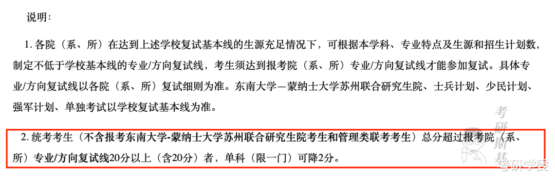不是所有学校都可以破格复试的,只有开设了破格录取政策的院校才能接受考生的申请,且每个学校的申请条件会不同,需要同学们去官网查看。比如东南大学在《东南大学2024年硕士研究生复试基本线》中提到统考考生总分超过报考院(系、所)专业/方向复试线20分以上(含20分)者,单科(限一门)可降2分。担心单科过不了线的同学有福了!