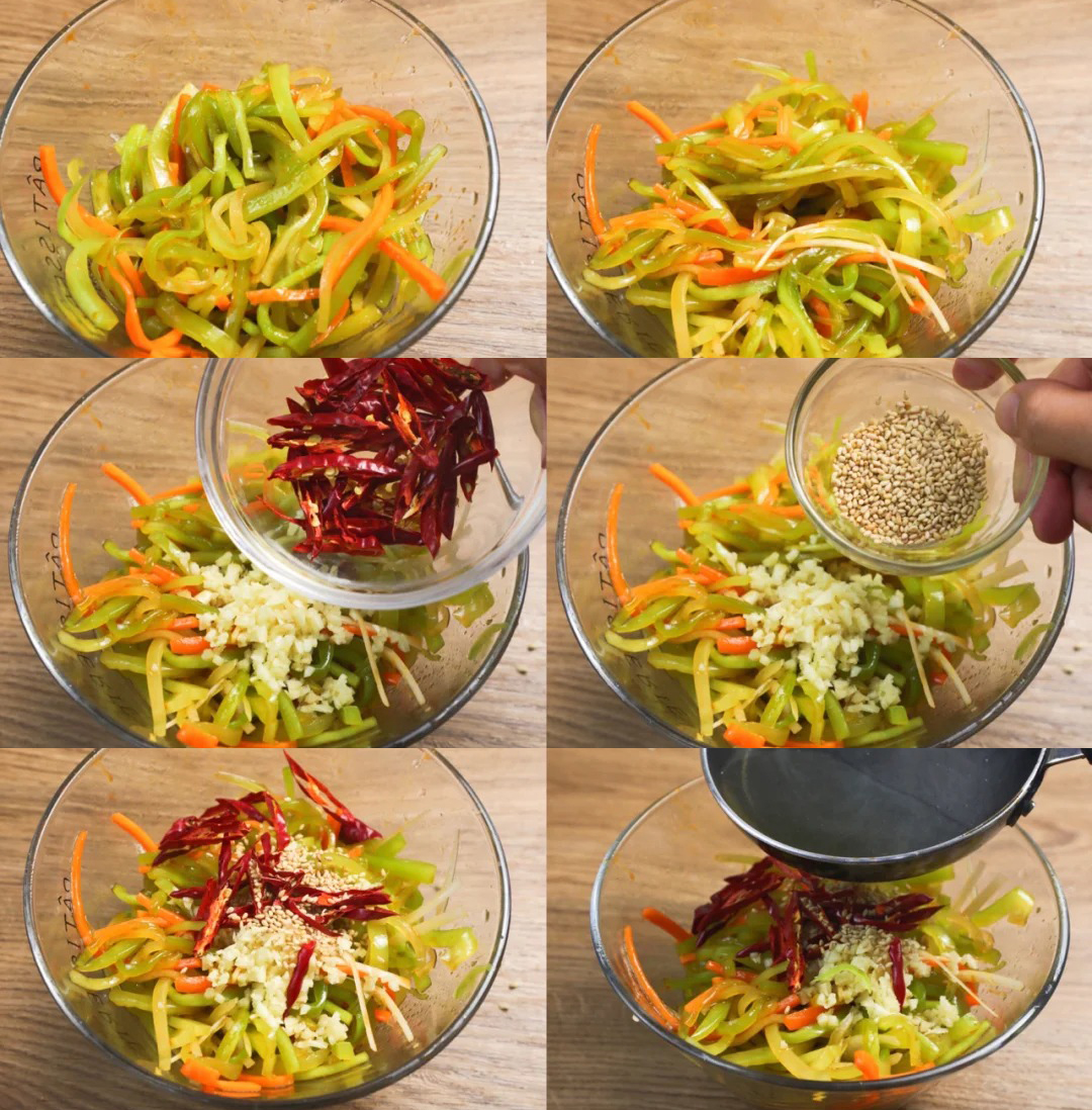 3️⃣放上蒜末、辣椒段、芝麻,泼上热油。滋啦啦~再次拌一拌,香辣爽口的凉拌莴笋丝就做好啦。
