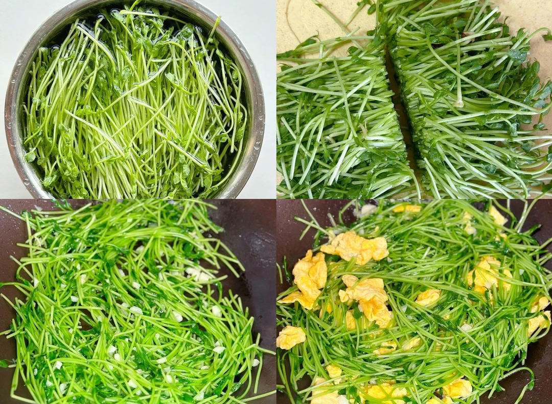 1️⃣豌豆苗清洗干净(带根的先切去根部),再对半切开。