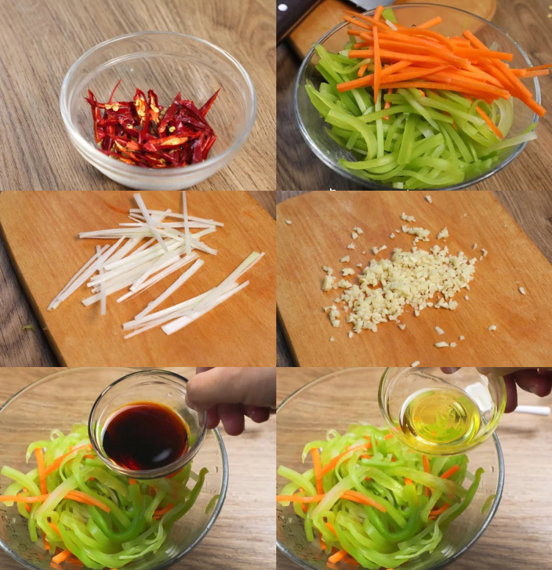1️⃣莴笋、胡萝卜、葱白切丝,蒜瓣切末,干辣椒切小段;