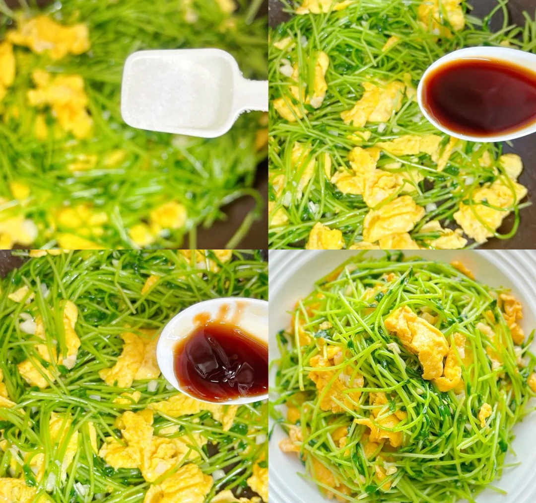 3️⃣热油放蒜末炒香,放豌豆苗炒至断生,放入鸡蛋继续翻炒,放一勺盐、一勺生抽、一勺蚝油进行调味,盛盘享用。